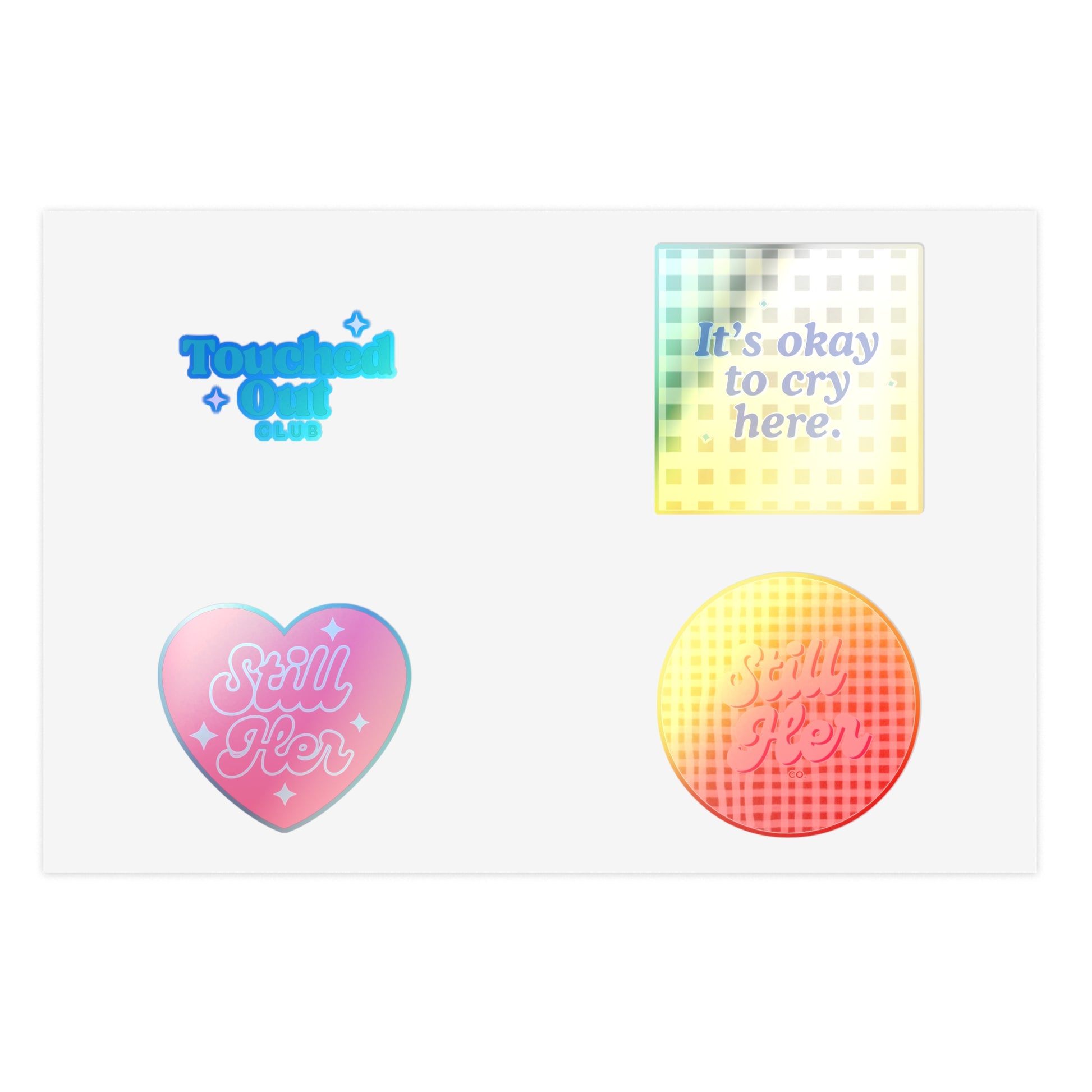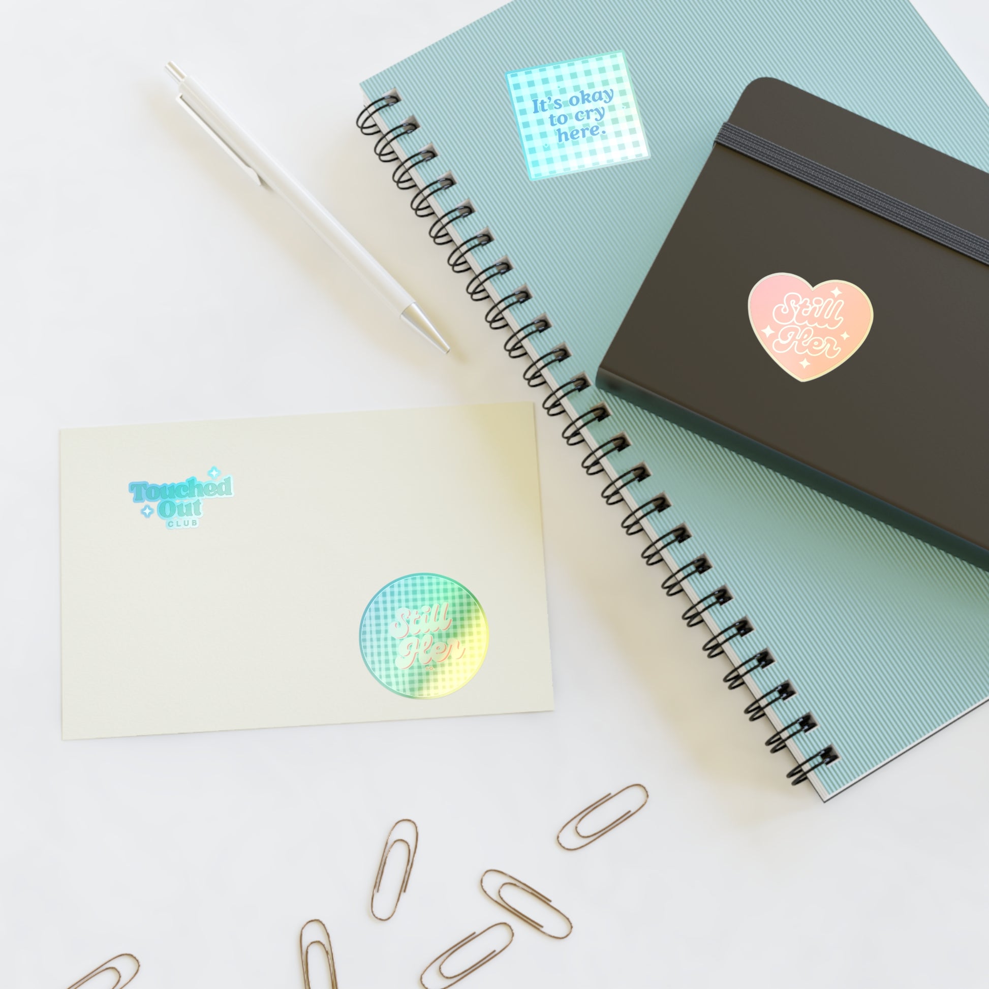 These sticker sheets feature Still Her Co logos, Touched out Club phrase, and It's Okay to Cry Here sticker. They give a creative and expressive vibe, perfect for journaling, personalizing items, or decorating gifts. Ideal for those who enjoy journaling, scrapbooking, or DIY projects. Relevant for birthdays, back-to-school, and mental health awareness occasions.